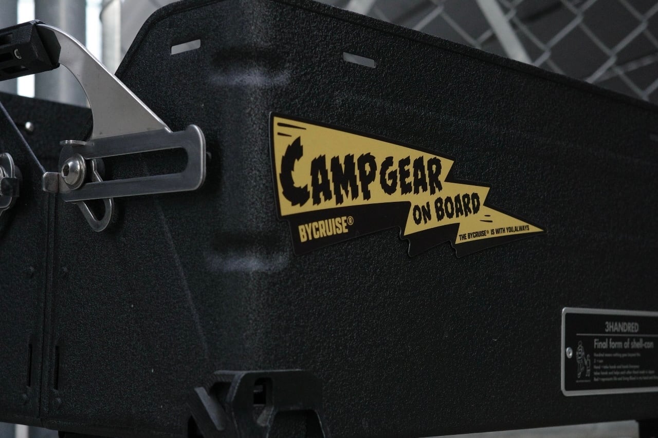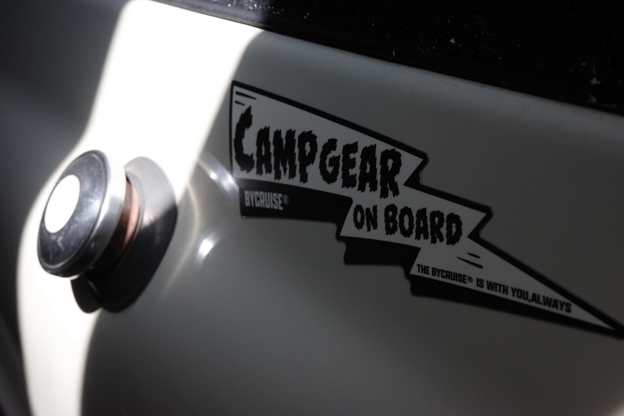 稲妻モチーフに「CAMPGEAR ON BOARD」と書かれたマグネットステッカー。