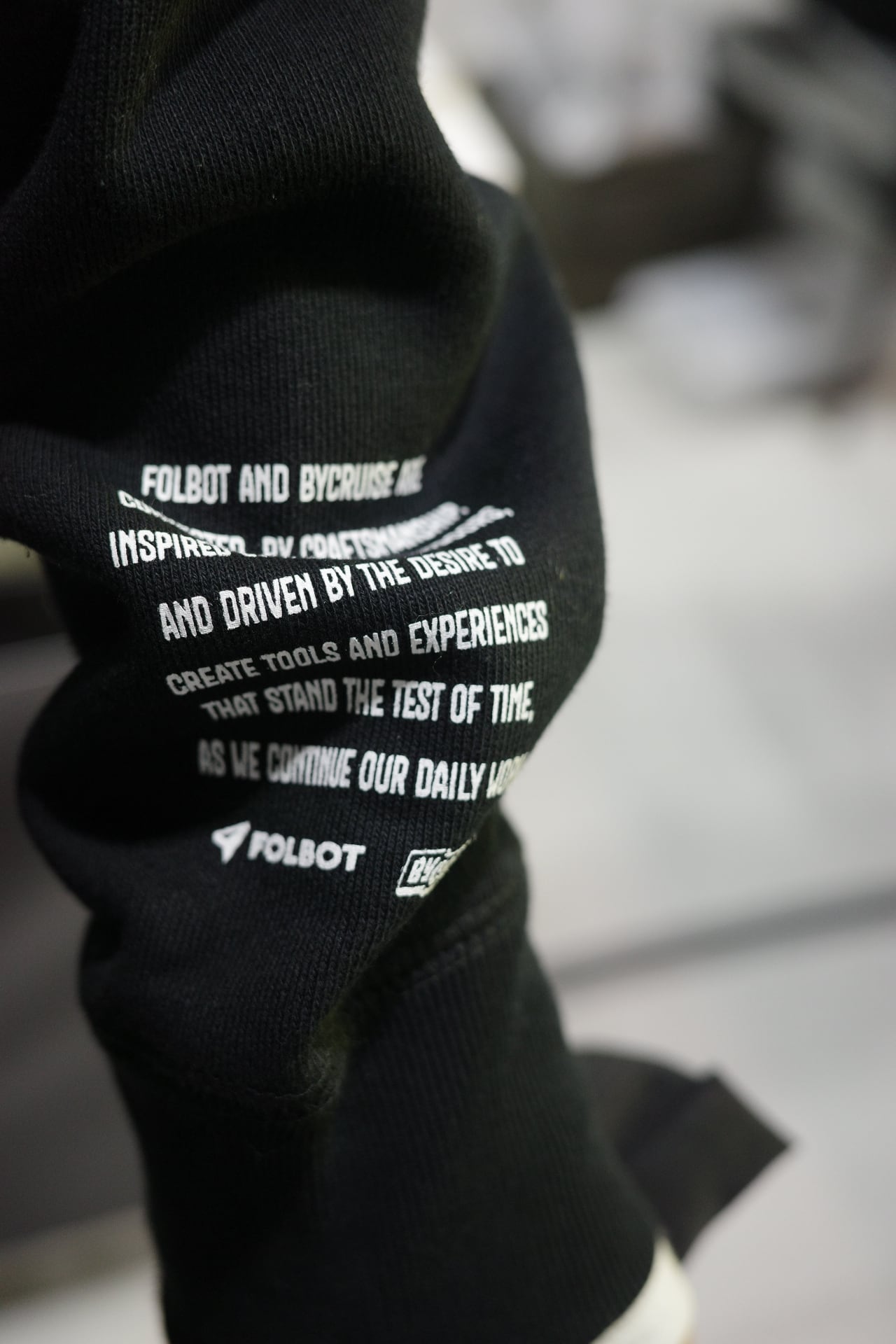 架空のコラボSUPが背面にプリントされたパーカーです。