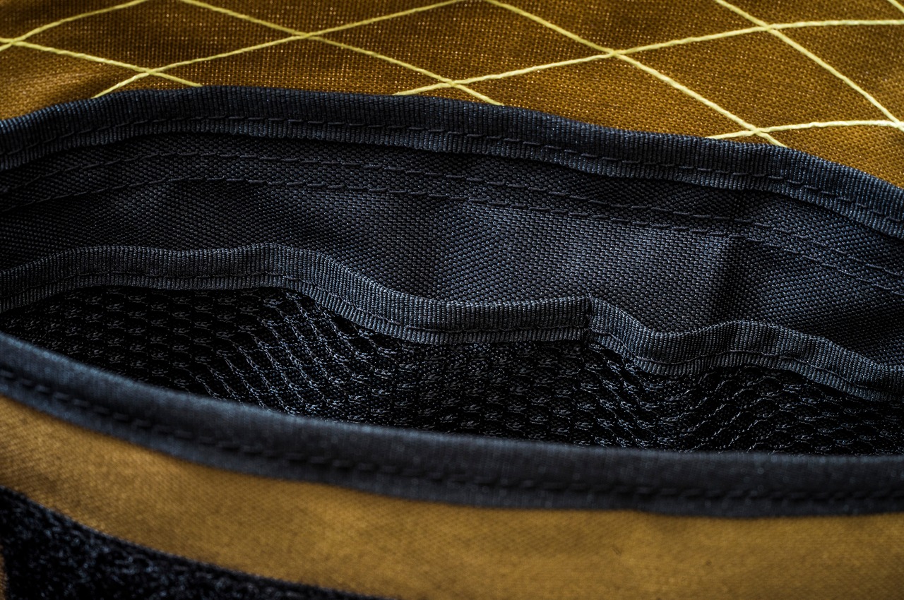 サコッシュの素材は軽量、防水、耐久性に優れたアメリカ素材X-PACを使用し、中にはコーデュラナイロンの裏地付き。