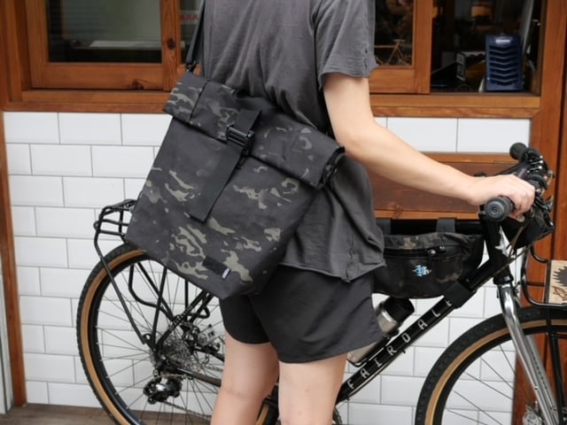 贅沢にX-PACを使用したロールトップタイプのパニアバッグ